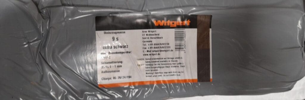 Witgert 9S Extra Schwarz. Extra black stoneware clay with 25% 0-1,0 mm chamotte. Well suited for hand building and sculpting with its coarse chamotte. Fired at 1000-1200 ° C