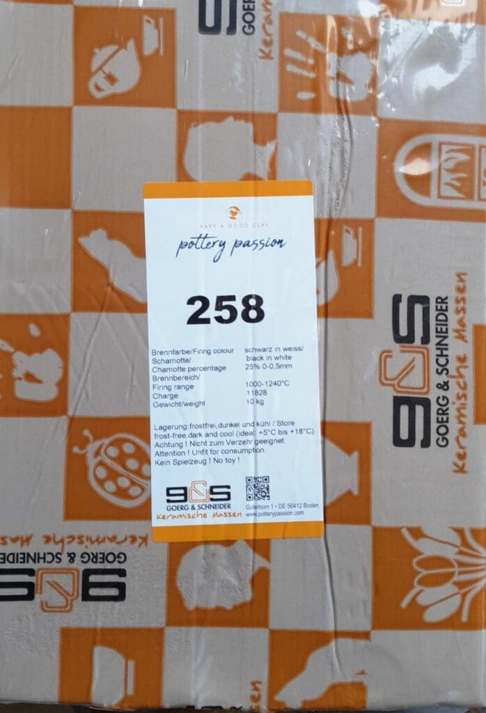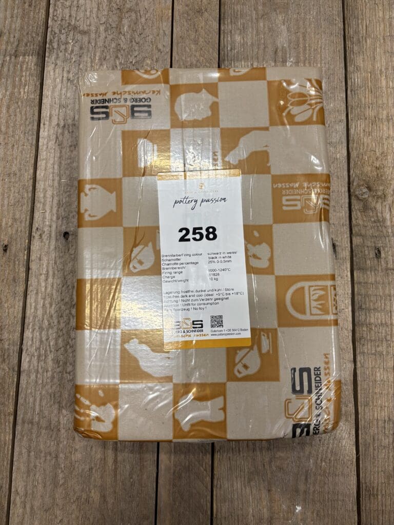 258 är en vit Stengodslera med 25% svart chamotte (0-0,5mm kornstorlek), vilket ger fin kontrast mellan den vita leran och svarta chamottekornen. Denna leran kan brännas i temperaturer mellan 1000°C och 1240°C. 258 är en pålitlig lera som kan användas till mycket skulpturer, ringling och kavling bland annat.