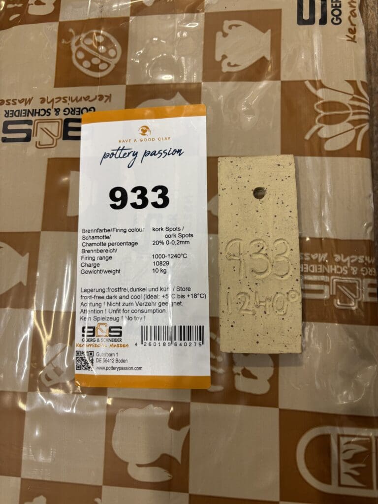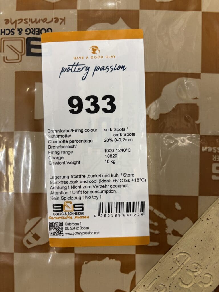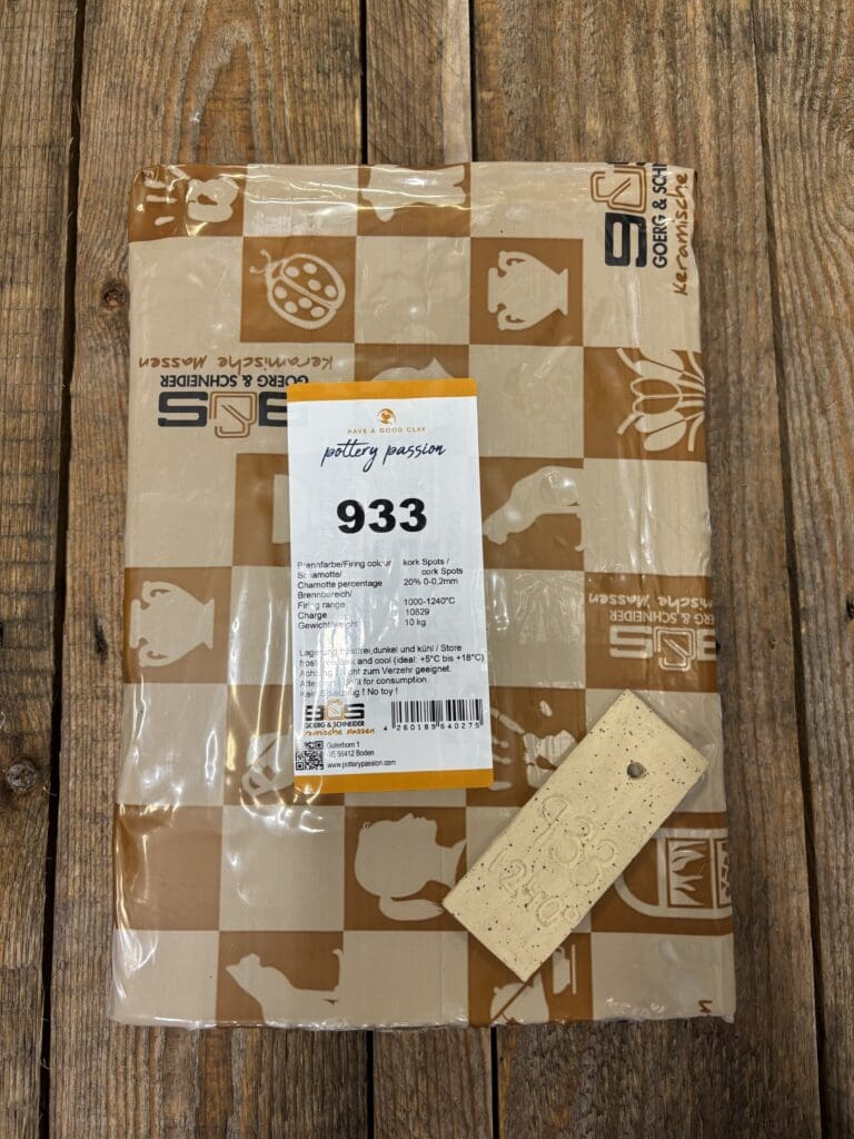 Georg & Schneider 933 är en linfärgad stengodslera med lavaprickar. 25%  chamotte med en kornstorlek på 0–0,2 mm. 933 passar att använda till drejning. Bränns vid 1000–1240 °C.