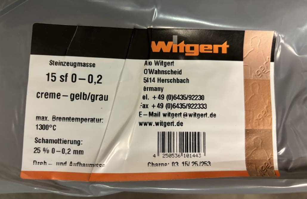 Witgert 15 är en Gul/Creamfärgad stengodslera med 25%  chamotte med en kornstorlek på 0–0,2 mm. Bränns vid 1000–1300 °C.